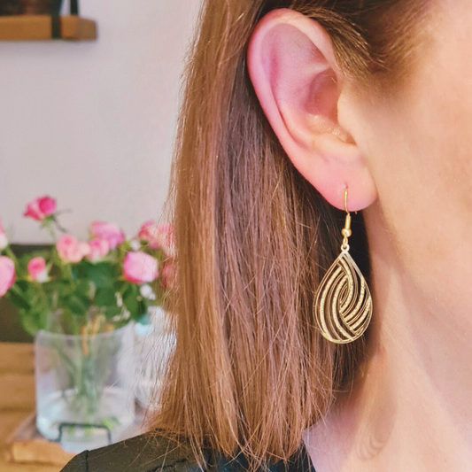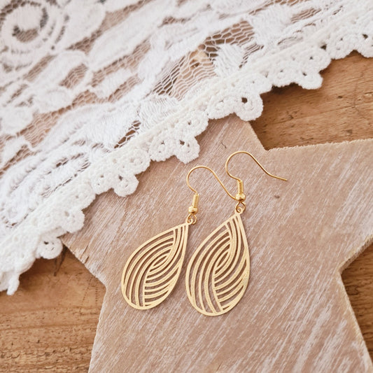 Gouden druppel oorbellen met sierlijk lijnenspel