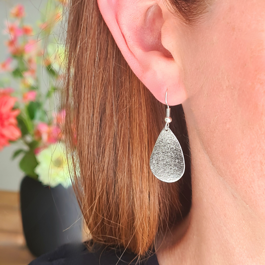 Grote zilverkleurige druppel oorbel met chique afwerking