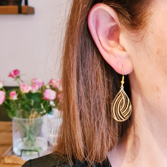 Gouden druppel oorbellen met sierlijk lijnenspel