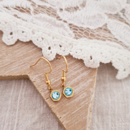Goudkleurige geboortesteenoorbellen met lichtblauwe steen voor Maart