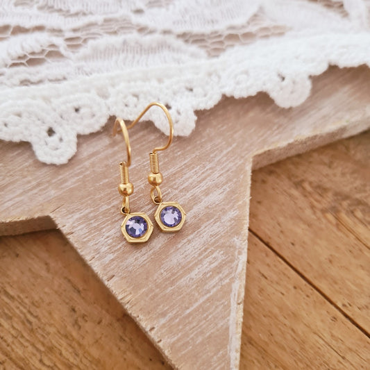 Goudkleurige geboortesteenoorbellen met lila steen voor Juni
