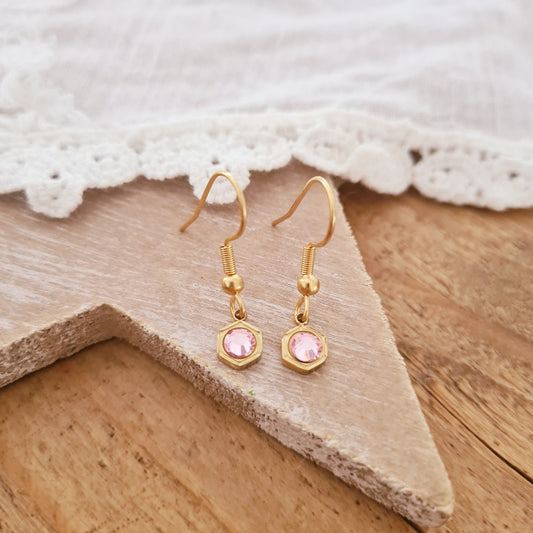 Goudkleurige geboortesteenoorbellen met lichtroze steen voor Oktober