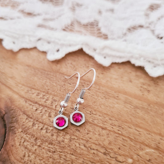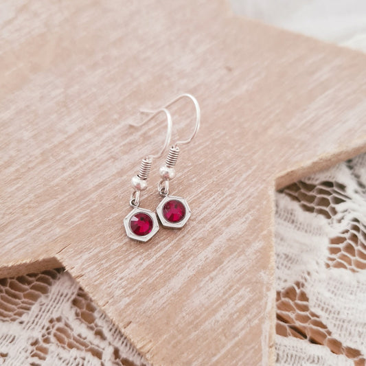 Zilverkleurige geboortesteenoorbellen Januari met rode glassteen