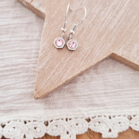 Zilverkleurige geboortesteenoorbellen met lichtroze steen voor Oktober