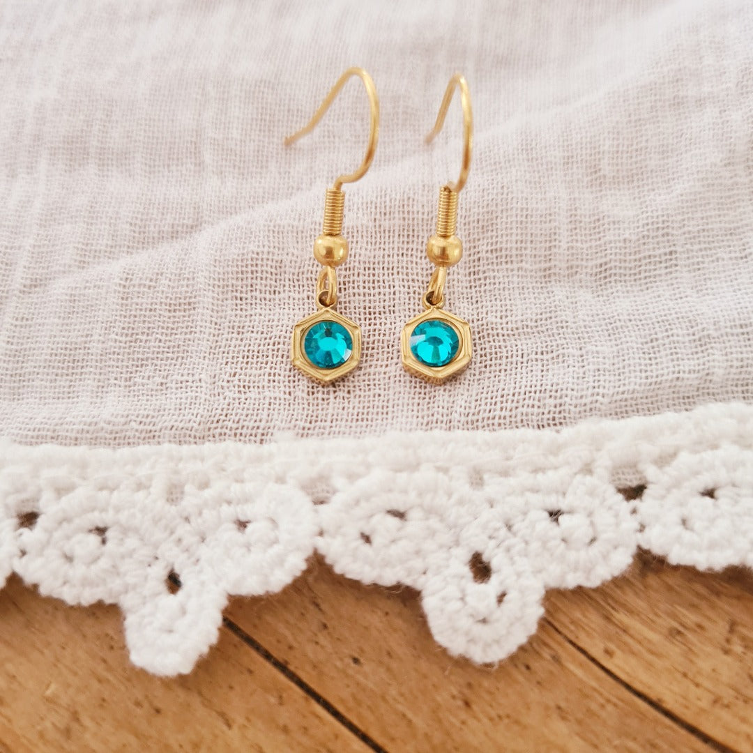 Goudkleurige geboortesteenoorbellen met blauwe steen voor December