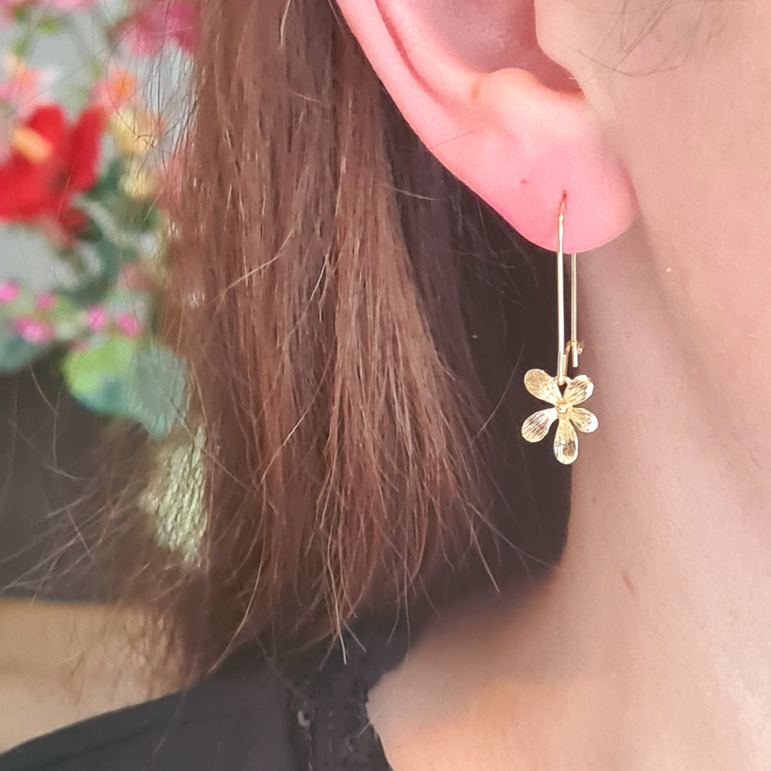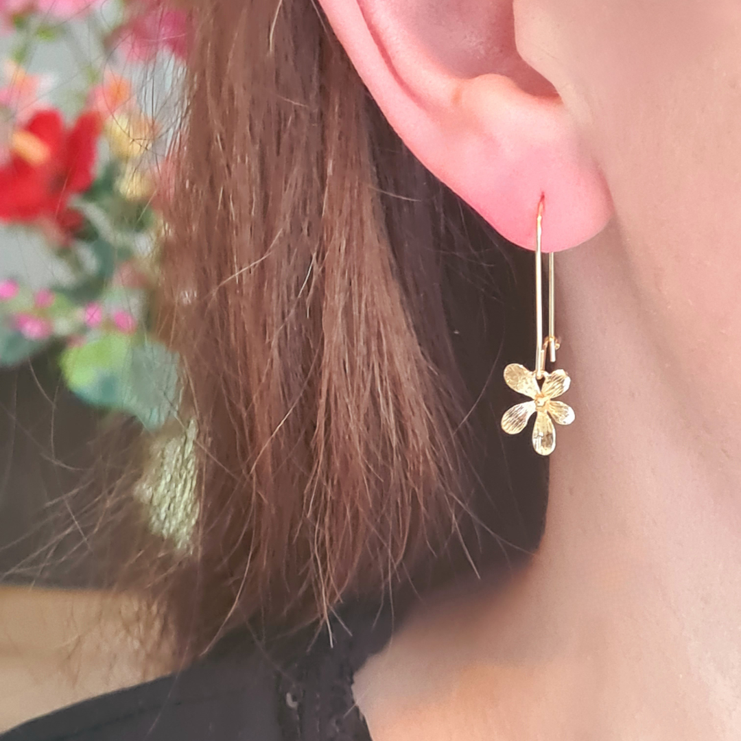 Deze gouden lange oorbellen met bloemhanger geven je look een verfijnde elegante touch. Of je nu een dag naar het strand gaat, een etentje hebt of op kantoor zit, deze oorbellen maken elke outfit een beetje bijzonder. Voel je prachtig — elke dag opnieuw.