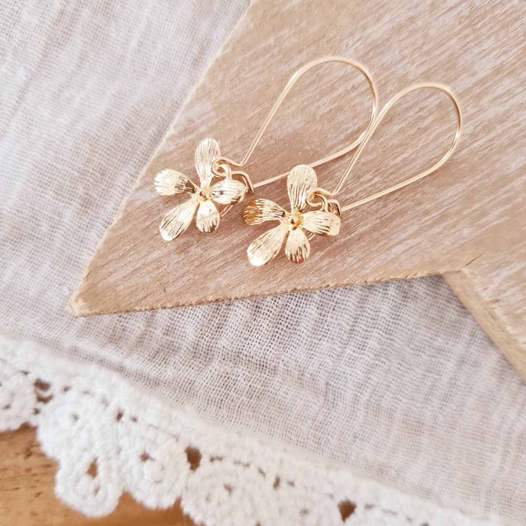 Gouden lange oorbellen met elegante bloem hanger