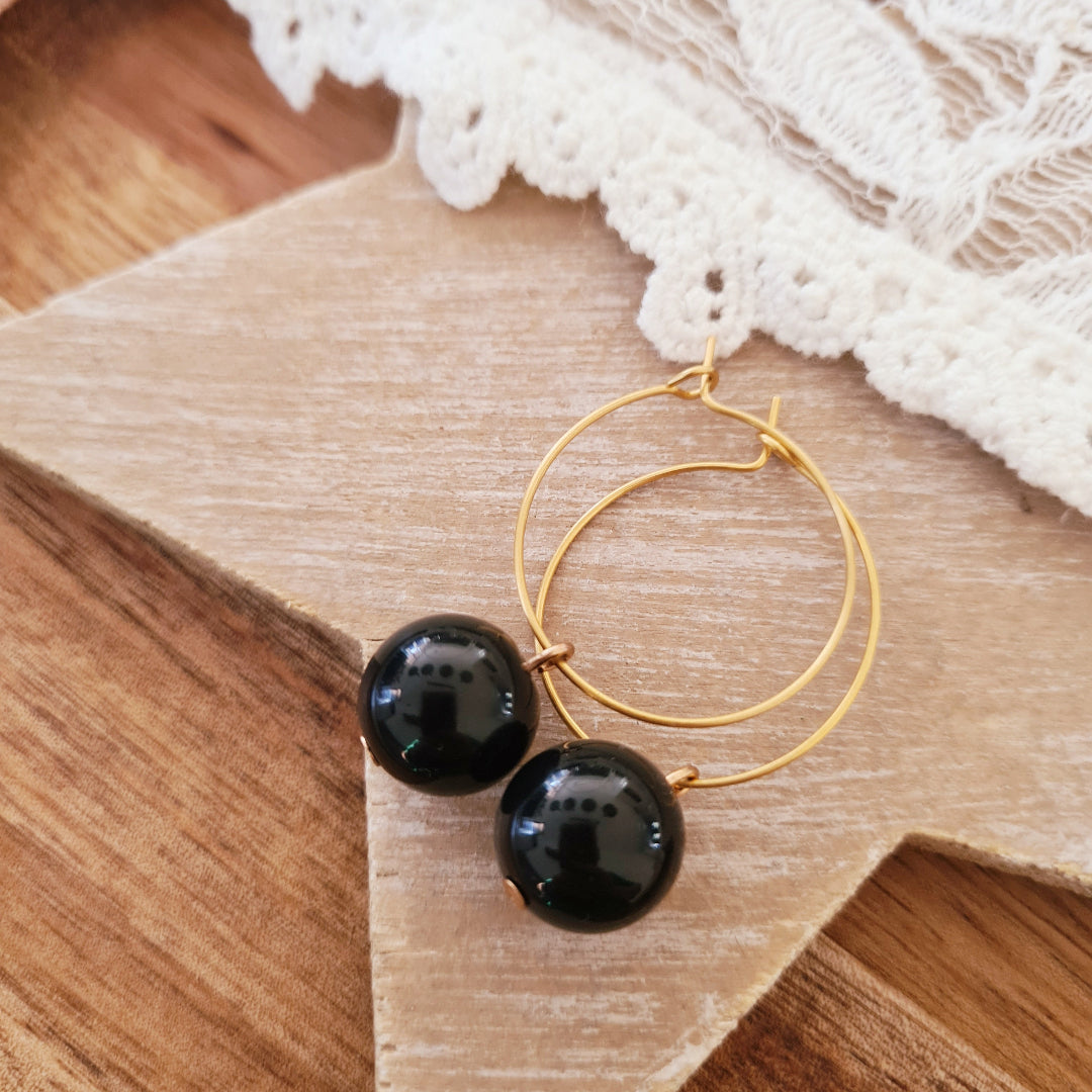 Een stijlvolle, goudkleurige oorbel met een ringetje van stainless steel en een diepzwarte obsidiaan edelsteen. De steen is subtiel facetgeslepen en heeft een lengte van ongeveer 1,2 cm. Dankzij het lichte ontwerp en het klikmechanisme draag je deze oorbel moeiteloos de hele dag. Perfect voor wie houdt van minimalisme met een krachtige uitstraling.