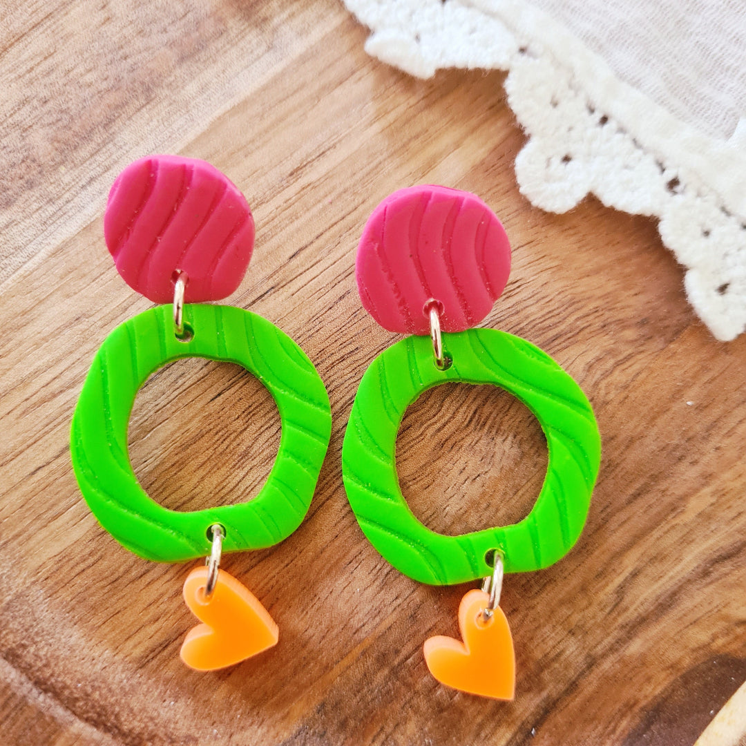 Deze vrolijke oorbellen van polymeerklei zijn gemaakt voor wie graag kleur draagt. De combinatie van speels groen en levendig roze vormt een opvallende basis, afgewerkt met een oranje hartje dat zachtjes mee beweegt. Ze zijn heerlijk licht en perfect voor zonnige dagen. Elk paar is uniek en slechts één keer gemaakt.