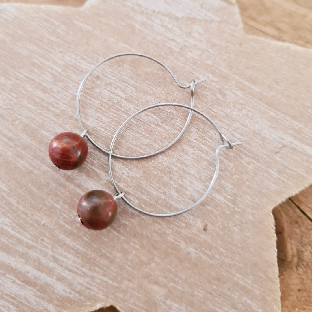 Stainless steel oorbellen in zilver met bordeaux Picasso jaspis steen