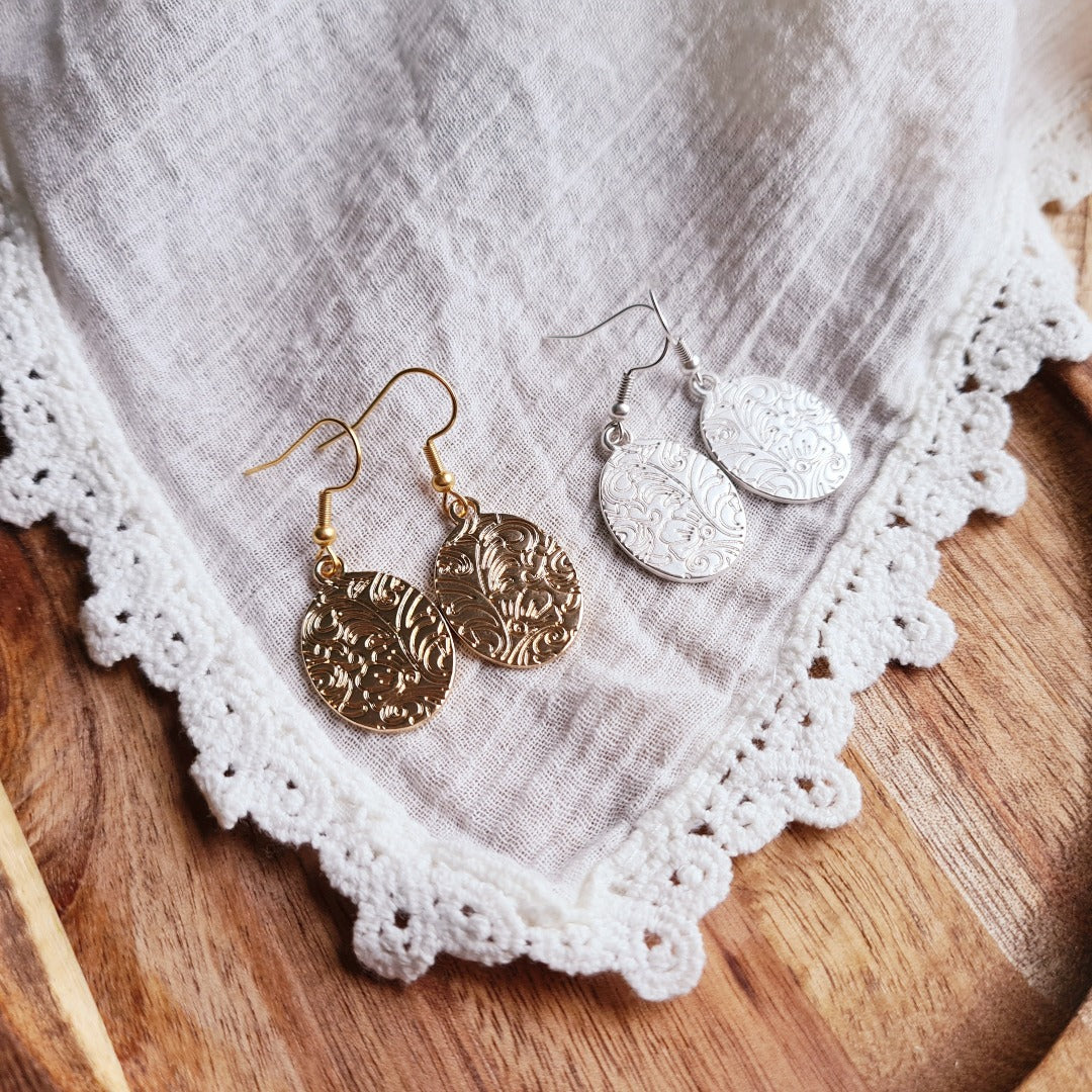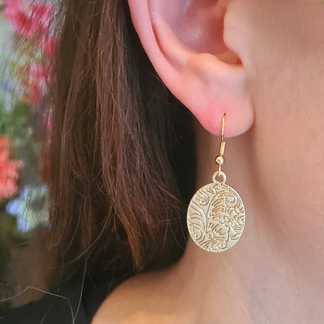 Deze ovale oorbellen zijn goudkleurig en subtiel bewerkt met een klassiek reliëfpatroon, wat ze een tijdloze en elegante uitstraling geeft. Dankzij het lichtgewicht ontwerp draag je ze comfortabel de hele dag. Ze zijn gemaakt van nikkelvrij metaal en hebben een zachte glans die zowel bij casual als feestelijke outfits past. Een stijlvolle keuze voor wie zoekt naar goudkleurige oorbellen met een unieke uitstraling.