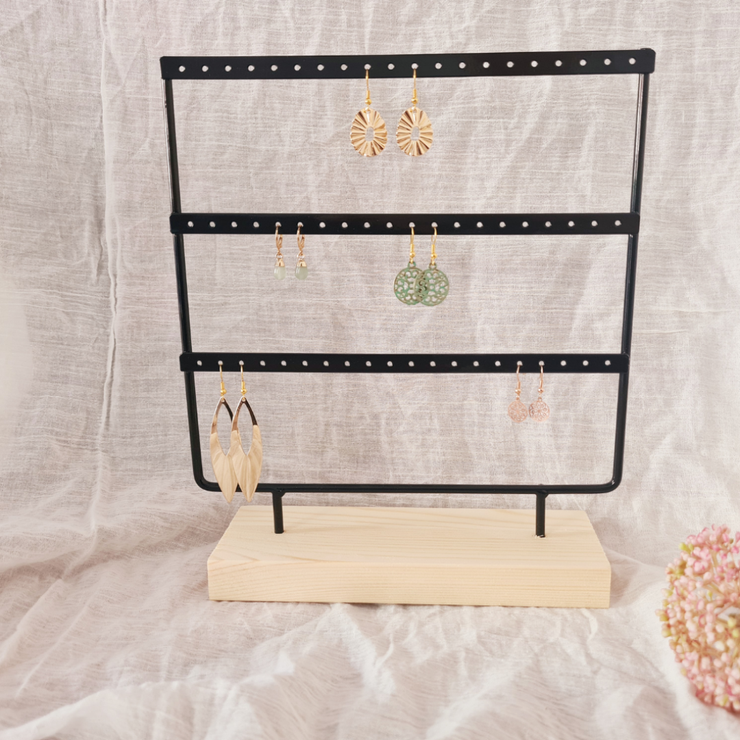 Zwart oorbellenrek met blank houten voet – 3 rijen, 60 gaatjes