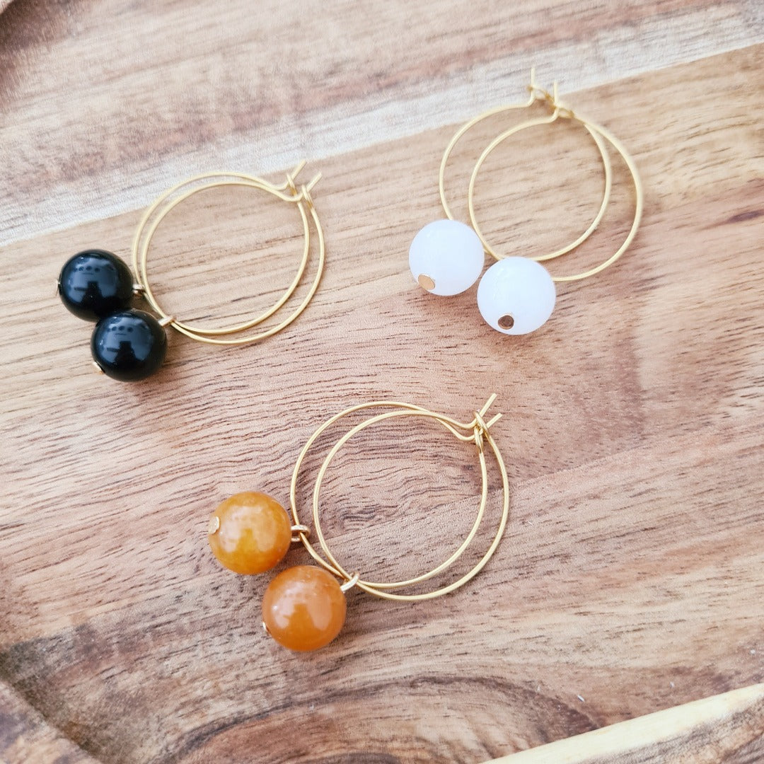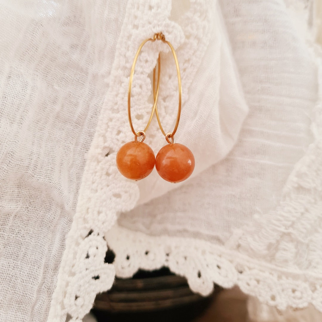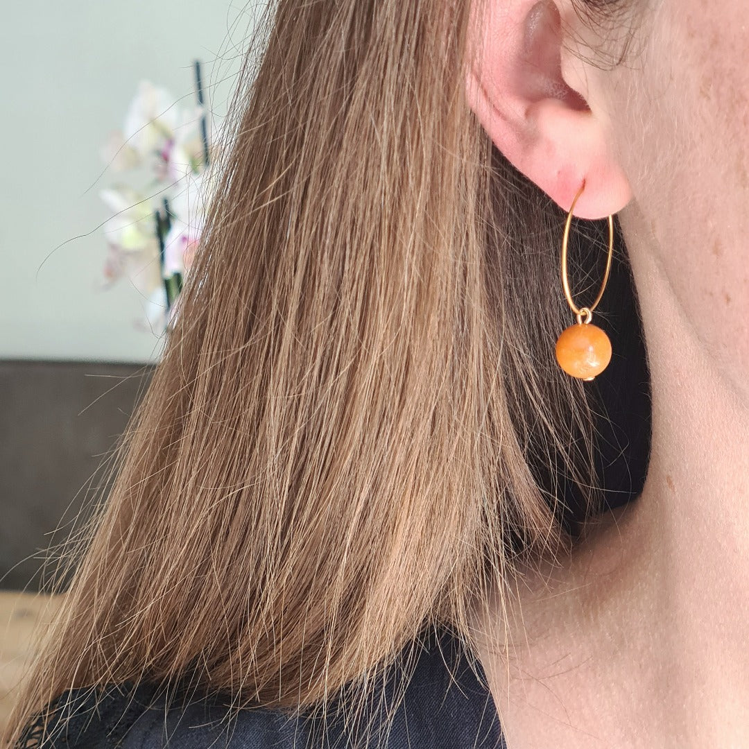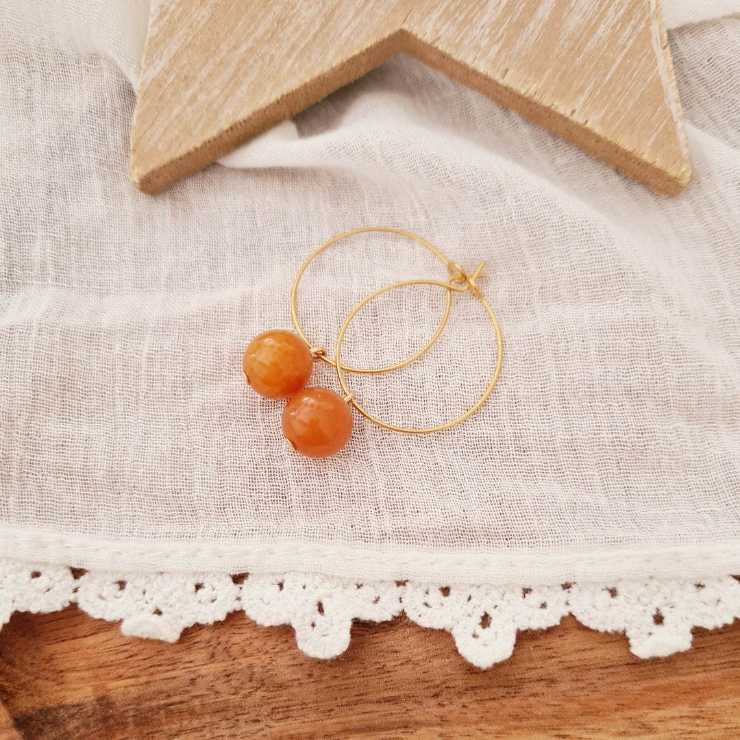 Deze gouden oorbellen met oranje edelsteen combineren een warme, vrouwelijke uitstraling met het comfort van stainless steel. De ronde druppelvorm van rode aventurijn zorgt voor een subtiel kleuraccent dat prachtig contrasteert met de goudkleurige ring. Dankzij hun lichte gewicht draag je ze moeiteloos de hele dag, van een drukke werkdag tot een avond uit. De combinatie van duurzame materialen en een zachte, natuurlijke tint maakt deze oorbellen geschikt voor elke gelegenheid. Ze zijn elegant, tijdloos en makkelijk te combineren met je favoriete kledingstukken.