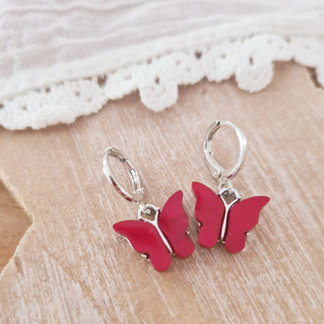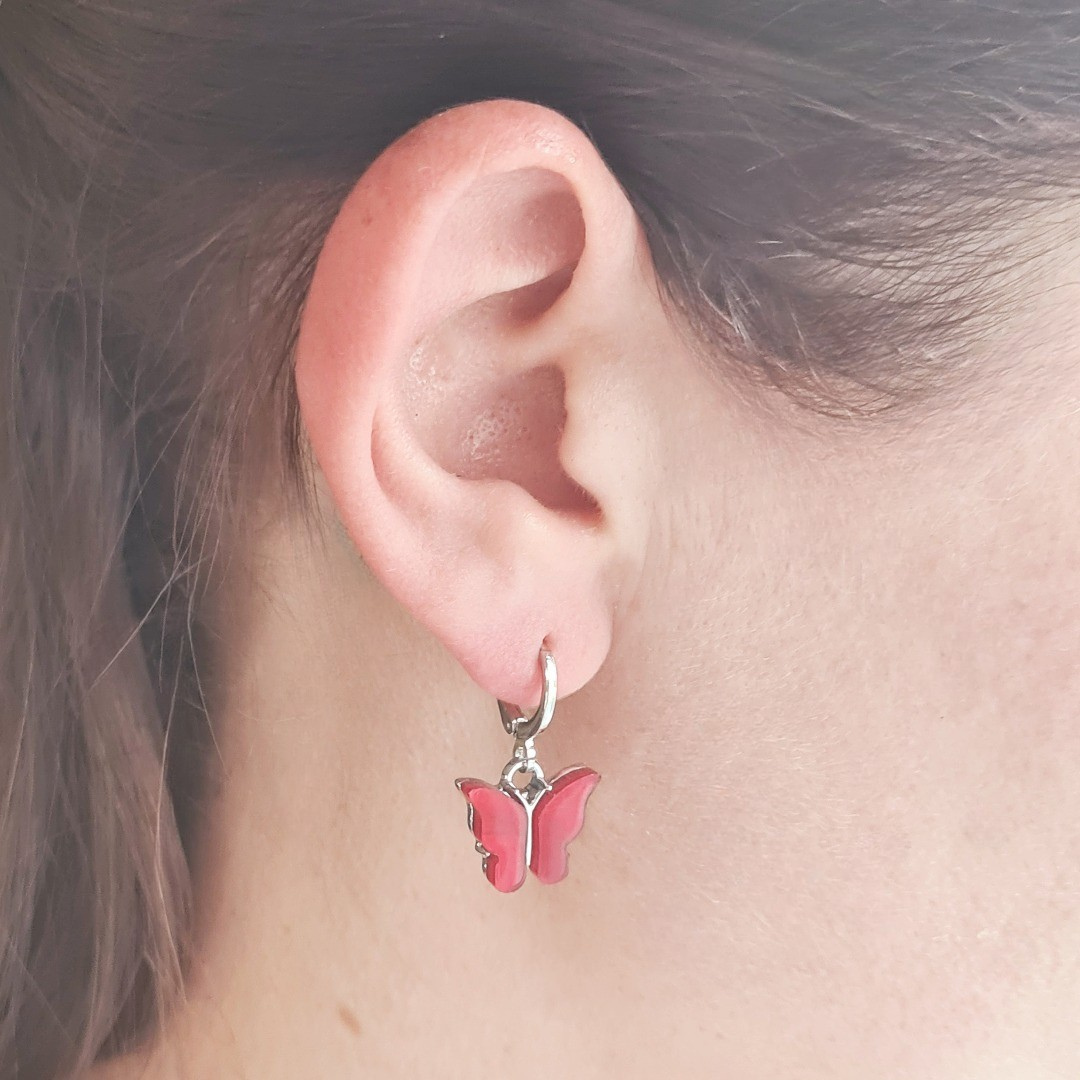 Deze zilverkleurige ringetjes met rode vlinderhanger zorgen voor een speelse en opvallende uitstraling. De frisse zilveren basis combineert prachtig met het levendige rood, waardoor dit sieraad een vrolijk accent toevoegt aan je look. Dankzij het lichte gewicht en het comfortabele kliksysteem draag je deze ringetjes moeiteloos de hele dag.