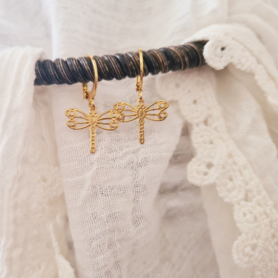 Deze oorbellen passen mooi bij rustige tinten zoals crème, beige en warm wit zodat de gouden libelle helder zichtbaar blijft en het detailwerk goed tot zijn recht komt.