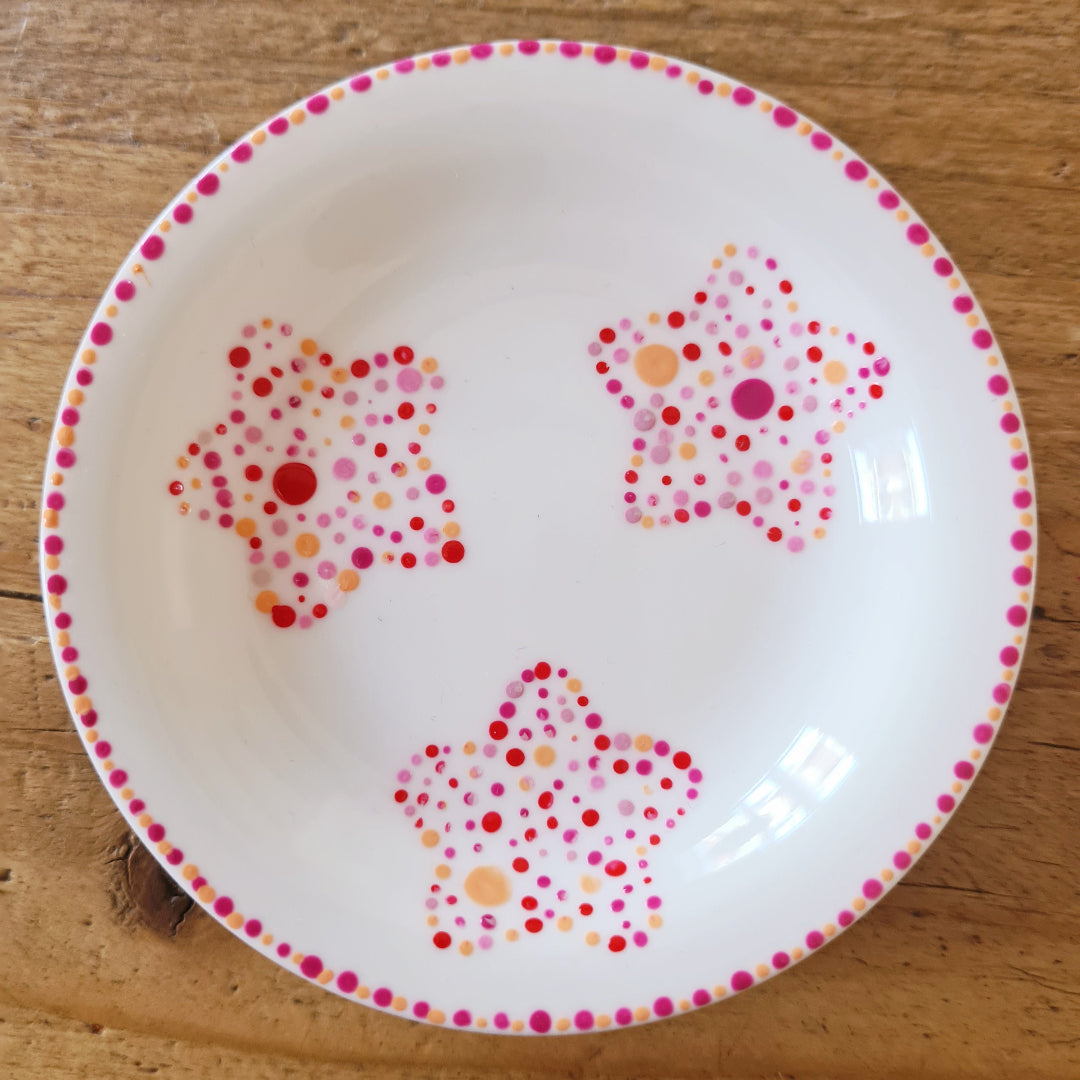 Een vrolijk, handgestipt schaaltje dat meteen een glimlach op je gezicht tovert. De drie sterren in warme tinten roze, rood en oranje geven dit ronde porseleinen schaaltje een speelse uitstraling. Elk stipje is met de hand gezet, waardoor geen enkel exemplaar hetzelfde is.