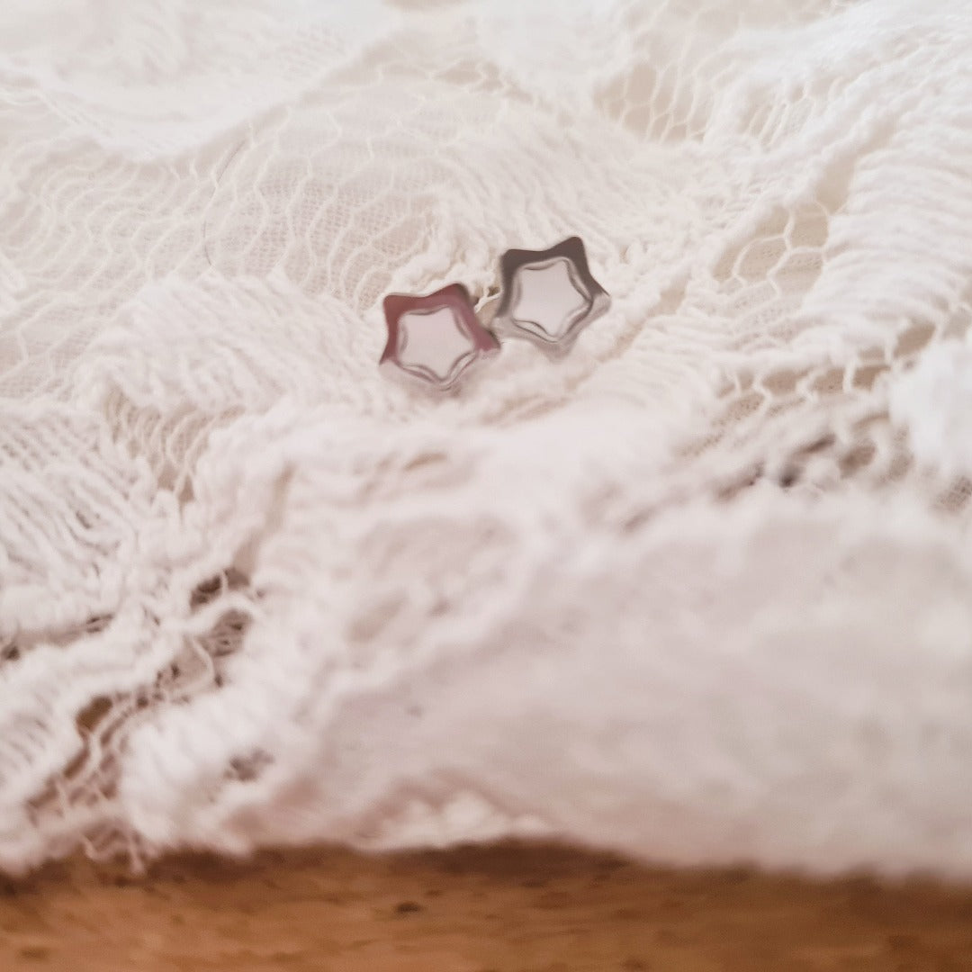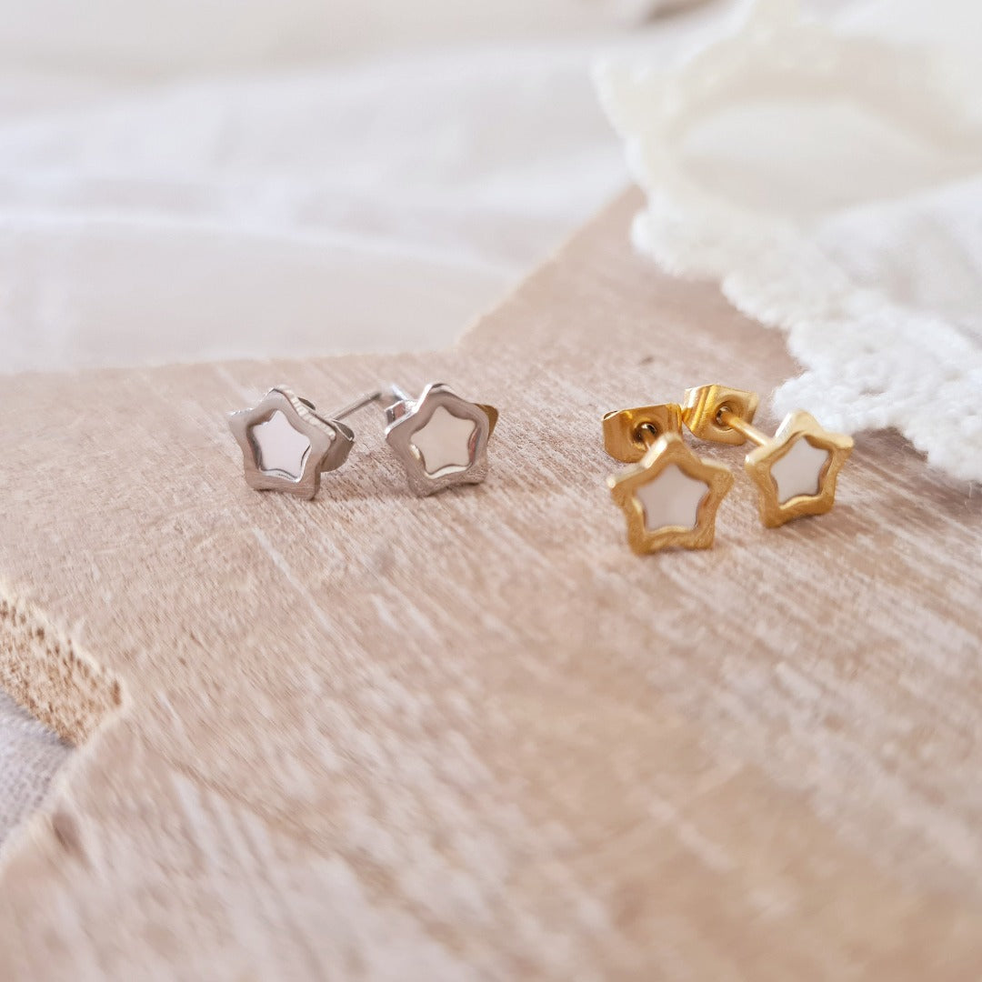 Een verfijnd paar oorbellen dat elegantie en zachtheid combineert. Deze zilverkleurige stervormige oorstekers met witte parelmoer kern hebben een rustige, glanzende uitstraling die moeiteloos bij elke stijl past. Hun subtiele schittering vangt het licht op een natuurlijke manier, waardoor ze elke dag bijzonder maken zonder te overdrijven.