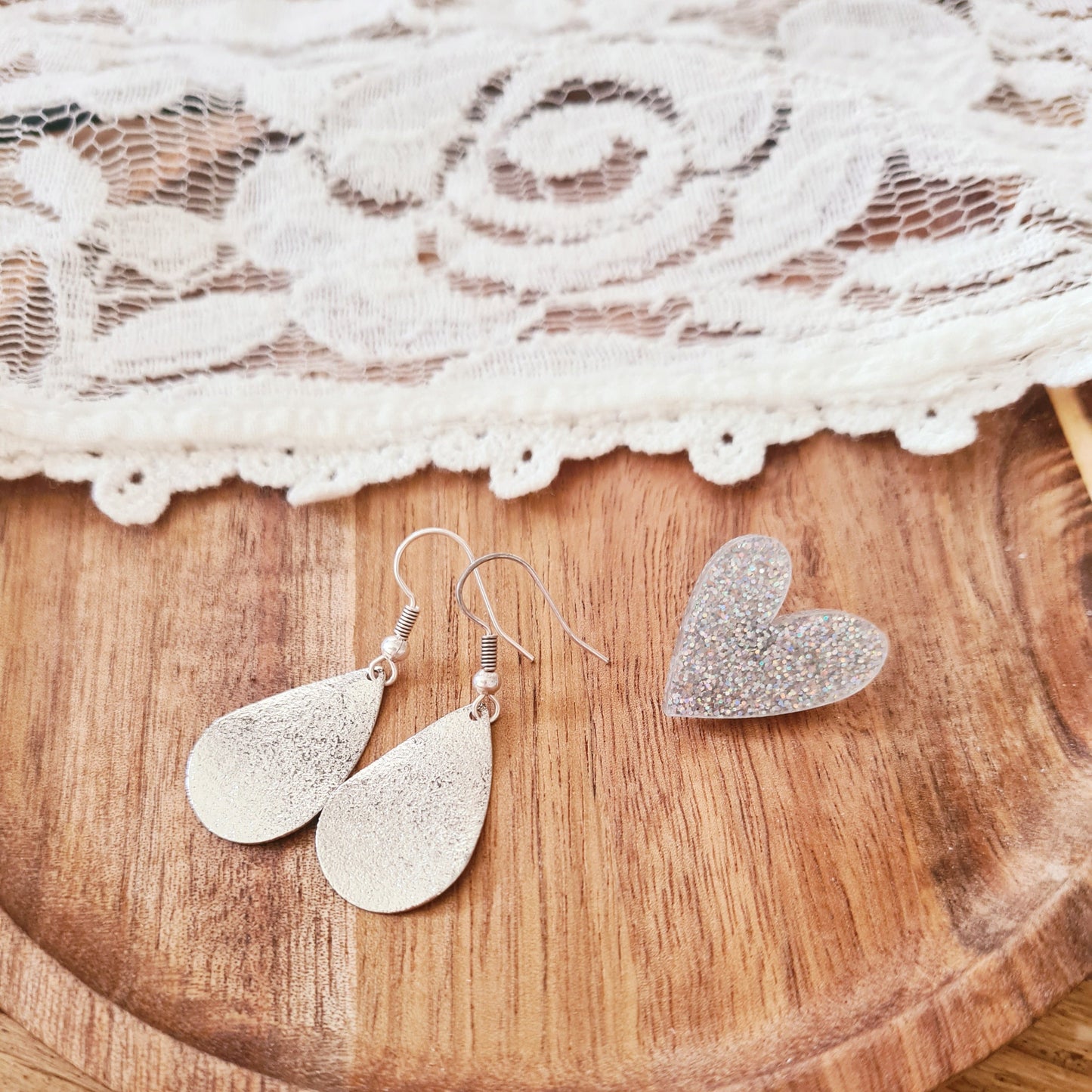 Voordeelpakket glitterhartjes pin met zilveren druppel oorbellen